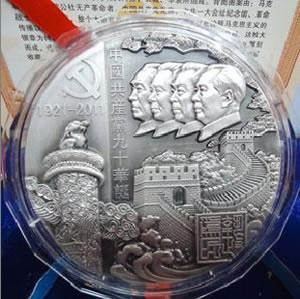 为了纪念中国共产党成立九十周年特制大银章一枚,正面图案为:中国共产党党徽,开国领袖毛泽东等伟人肖像、长城、华表所组成。背面图案为:马克思肖像、巴黎公社无产革命者、中国共产党党旗、中共一大会址纪念馆、革命战士塑像所构成,整个大银章造型大气磅礴,内含丰富以此诠释马克思主义的传播以及中国共产党于1921年在上海成立,已经走过九十年的辉煌历程。这枚大银章为纯银铸造直径90毫米,由上海造币厂高级美术工艺大师童友明先生雕刻而成,造型精致大气,内涵丰富,现已由中国国家博物馆、中国军事博物馆等收藏。