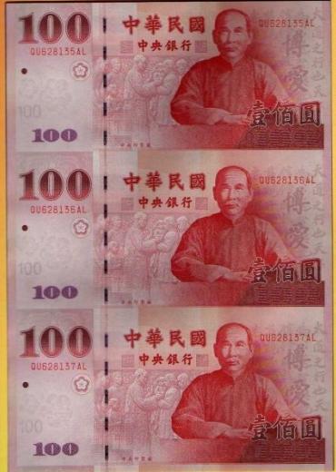 為庆祝建国百年,央行将於明年1月6日发行「庆祝中华民国建国一百年」新台币壹佰圆券。央行发行局局长蔡炎树指出,明年发行的建国百年壹佰圆券将有4亿张,规格、顏色都和现行流通的百元钞一样,但在左下方会将文字调整為「庆祝中华民国建国一百年」。蔡炎树说:『(原音)大概4亿张,过年换新钞就是用这个换,稍稍比平常多一点,3到5千万有啦,平常大概3.5亿张。跟我们现行流通壹佰圆券所有规格、防偽特性都一样,只是在背后写了一个「庆祝中华民国建国一百年」。』