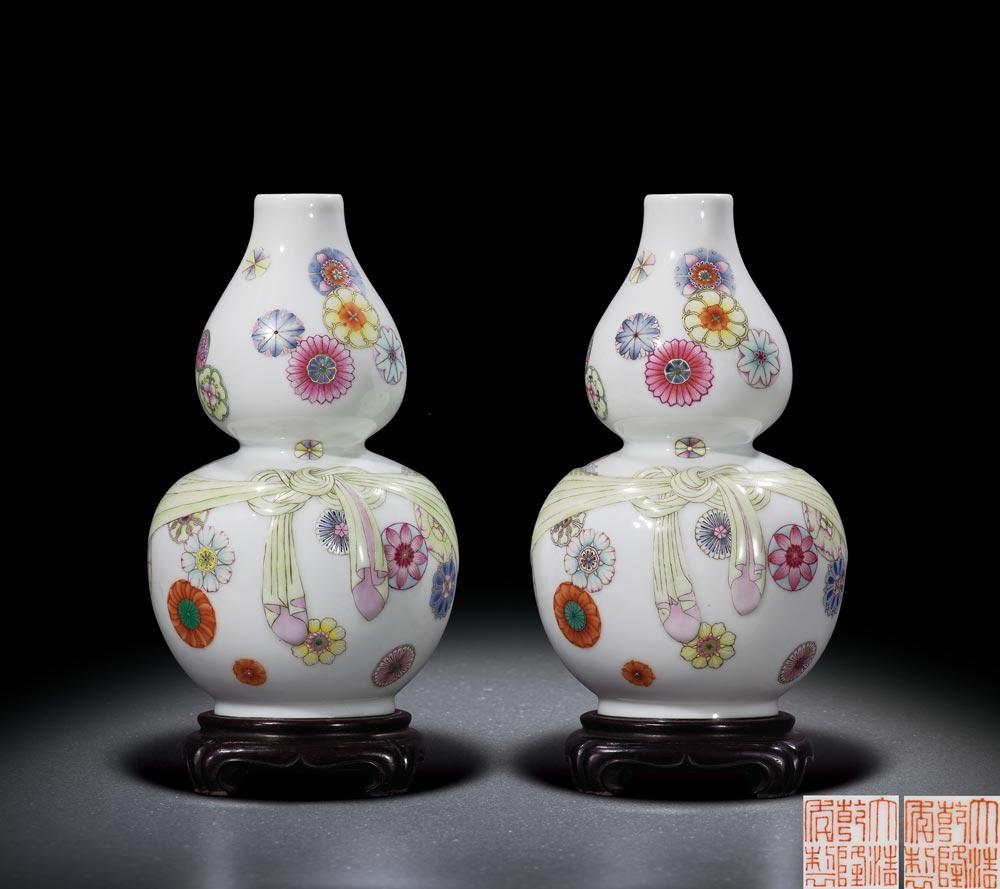 2013年香港苏富比春季拍卖会的“清康熙御制胭脂红地珐琅彩莲花图碗”,刷新了康熙时期瓷器拍卖的最高价成交纪录,使得康熙瓷器实现了突破5000万元大关的进程2001年苏富比拍卖会上,“清雍正粉彩蝙桃橄榄瓶”被拍至4150万港元,创当时清代瓷器的市场最高价;尤其值得一提的是:2006年佳士得推出的大收藏家张宗宪收藏的“清乾隆珐琅彩杏林春燕图碗”以1.5123亿港元拍出,创当时粉彩瓷器的市场最高价。更有甚者,2011年佳士得春拍上最为人所瞩目的“清乾隆粉彩镂空团螭龙纹时时报喜转心瓶”,估价高达2亿元,成为目前估价最贵的粉彩瓷。
