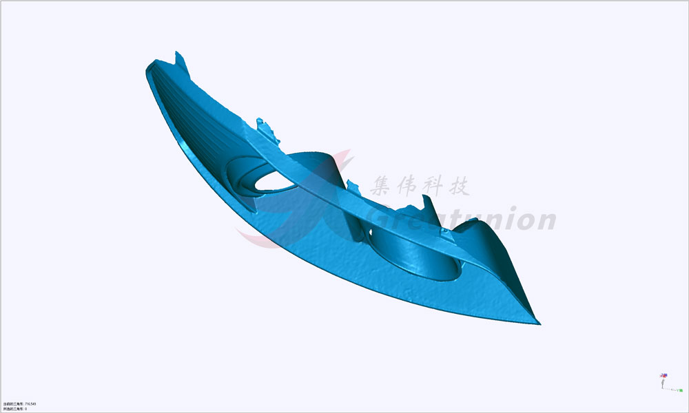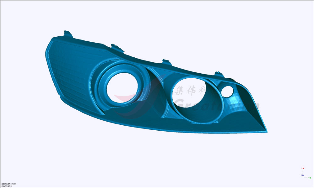 采用集伟汽车三维扫描仪H scan700手持式激光扫描仪进行汽车车灯三维扫描,,不需要专业的技术员,普通技术人员即可针对汽车车灯、保险杠等汽车钣金件抄数,从而得到STL三维数据。把需要修复的地方根据其它周围的数据进行复原,从而得到一份完好的数据,再根据这份数据用机加工或者3D打印机制作出来一个和原始模型一模一样的产品,就可以直接装在汽车上使用,这样的工艺大大的减少工作难度和工作量。