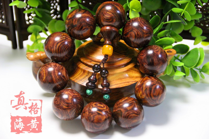 对于普通的消费者来说实在是很难辨识。海黄,现在学术界比较认同的,学名称“降香黄檀”,因为它有一种中医里称为“降香”的味道。越黄,有的人则归之为紫檀类,叫“越柬紫檀”。但这个归类总感觉未必妥当,因为越黄未必发“紫”色。先说相同之处,都很“香”,即锯开后,都芳香四溢,甚是迷人;都很“花”,即打磨完花纹绚丽多彩;都很“黄”,即颜色大致都是金黄色;都很“密”,即毛孔都很小;都很“滑”,即手感极顺溜;都很“莹”,即打磨后光洁如镜,局部莹光闪烁;都很“鬼”,即有很多结节,鬼脸纹都不缺。不同之处,相对而言,海南黄花梨纹理(棕眼)细,越南黄花梨纹理粗一些海南黄花梨味道一些,而越南黄花梨香味略小。海南黄花梨纹理好,鬼脸多,即所谓的虎皮纹,越南黄花梨相对差一些。在颜色上,海南黄花梨颜色深一些,越南黄花梨颜色浅一些。而且旧木材原料来说,越南黄花梨树材粗大,海南黄花梨直径普遍较小。 哪里可以买到黄花梨手串1.8cm海南黄花梨的寿星摆件