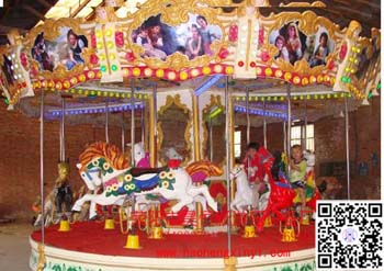 “ 儿童游乐设备豪华转马”顾名思义就是豪华的旋转木马,此游乐设施是一种垂直轴类单转体起伏型游艺机,是模拟跑马厅的娱乐活动而设计的,该儿童游乐设备的上部设有彩色的锥形顶棚,游乐设施顶棚的周圈装有五彩缤纷的优质玻璃钢装饰板,更显豪华气派,俨如华丽的跑马厅。