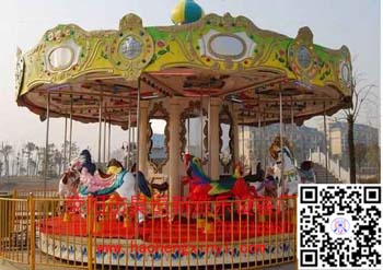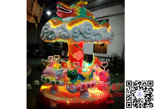 游乐设施祥龙转马头部防雨防晒,上部边缘以及儿童游乐设备转马中心部分用玻璃钢制成,并有镜子和各种造型飞檐装饰,美观大方,又不失童趣。游乐设施转盘采用竹木板制成,结实耐用,安装方便,具有隔音效果,防水效果好,采用“中国蓝”着色的竹木板与形态各异的木马相映成趣。