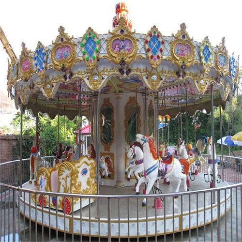 12座豪华旋转木马是我公司2016年主打产品,自上市以来得广大用户的一致好评。相对老款的转马产品,该产品在设计上有很大的突破,外观时尚大方,中心采用锥形结构,动感极强。