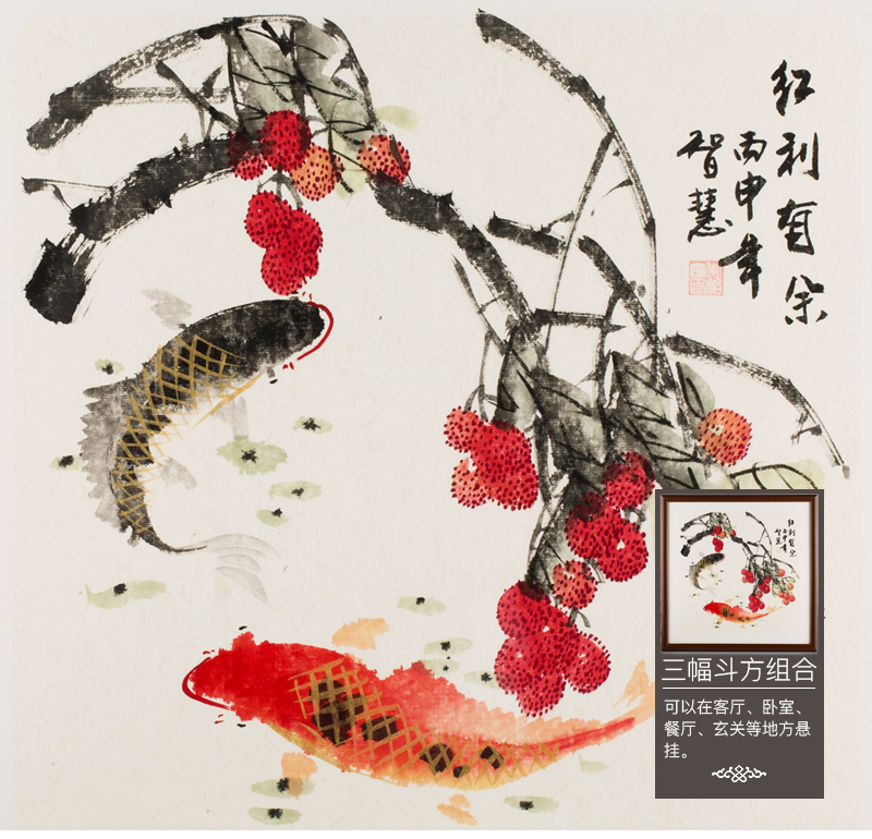 《吉祥如意图》花鸟斗方 牡丹荷花荔枝锦鲤