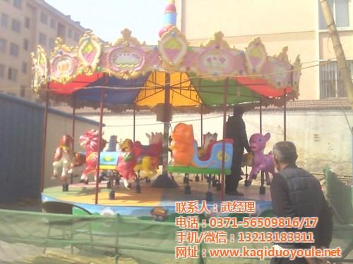 转马游艺机,外形新颖,颜色绚丽,是青少年朋友们非常喜爱乘坐的游艺机。转马启动之后转盘匀速转动,形态各异的转马随之上下起伏,使游乐者产生纵马扬鞭、驰骋疆场的感觉。本产品适用于公园游乐场、少年宫、生活广场、社区等人口密集流动场所。该产品采用玻璃钢材料制作,具有环保、安全、耐腐蚀、稳定性好等特点,可根据场地条件定做。