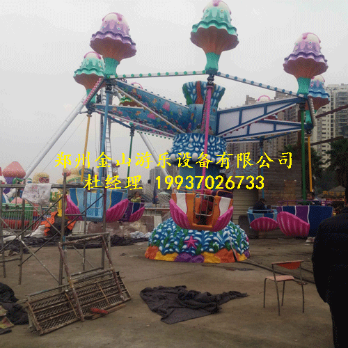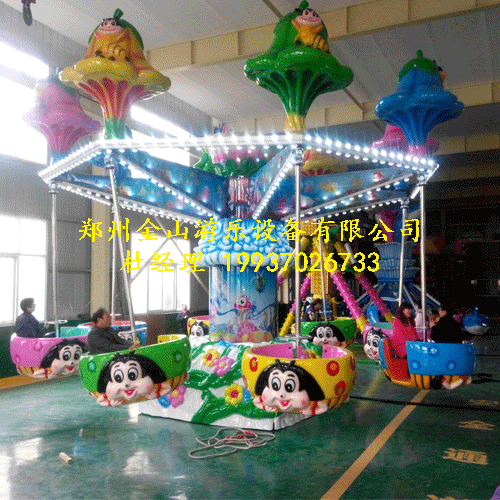 逍遥水母由上旋转大盘倾斜旋转运行,可以在运转时同时进行摇头,升降,和旋转等cj性动作,同时座舱可以由乘客手动控制自由旋转,可自由控制旋转速度,座舱上部的装饰是造型可爱的的水母造型。在夜幕下彩灯闪烁,游玩更浓。新型游乐设备逍遥水母不但性能优异,操作简单,而且造型新颖、彩灯装饰华丽璀璨,它具有高空驾驶之惊险,自由之悠闲,是一种新颖cj的新型游乐设备。 逍遥水母有6臂、8臂等型号,中轴和大臂配有彩灯,夜晚开放更是美丽壮观!