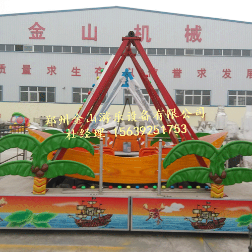 海盗船、迷你海盗船工作原理:启动电机,通过带动驱动轮胎,在摩擦力的作用下带动船体来回摆动,一次比一次推高至船体摆到z高位置,电机断电停止驱动,船体处于惯性自由摆动阶段,当船速较低后,制动气缸打开使制动轮胎上升,制动轮胎压上船底摩擦板,制动器强制刹车,船体经过数次摆动后停止。 产品材料:玻璃钢,优质钢材。 适用场所:游乐场,商场门口,广场,公园 ,生态景区等客流量集中密集的平坦公共