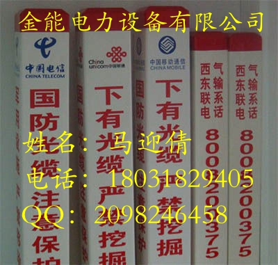 玻璃钢标志桩:经高温压制而成。抗冲击,耐磨损,耐高温,耐腐蚀,可以抗水、汽油、酒精、电解盐、醋酸、盐酸、钠钾化合物、尿、沥青,适合各种酸碱土壤。使用寿命长达30年。内容采用丝网印刷技术,警示效果好,不需要维护。重量轻,便于运输安装。无回收价值,自然防盗。
