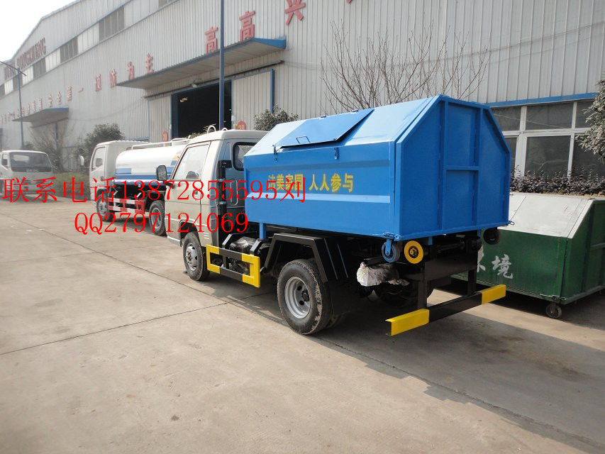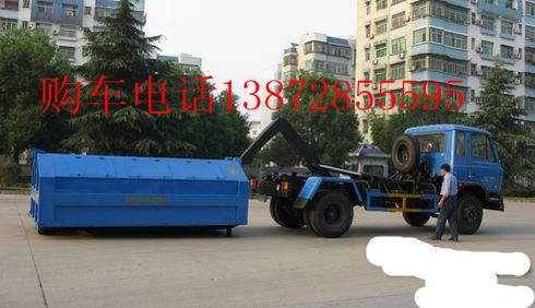 4) 拉臂式垃圾车:又称车厢可卸式垃圾车,可一车配多个垃圾斗,各垃圾点放置多个垃圾斗,带自卸功能,液压操作,倾倒方便,在装卸的运输过程中可有效地避免二次污染。