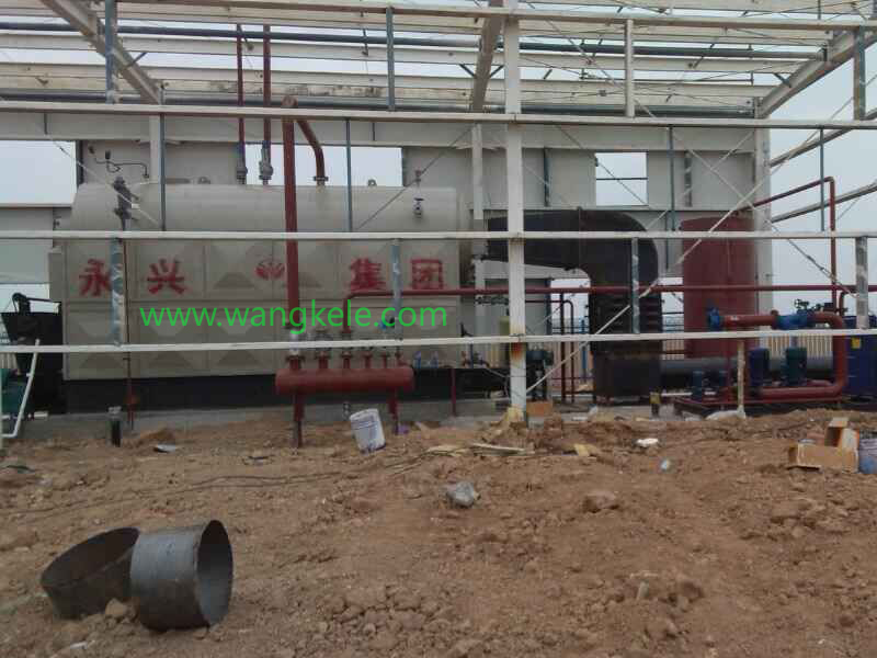 链条炉排锅炉,河南永兴锅炉:是一种卧式三回程水火管混合式锅炉,在锅筒内布置一束螺纹烟管。炉膛左右二侧装有光管水冷墙。采用轻型链条炉排实现机械加煤,配有鼓风机、引风机进行机械通风,并装有刮板式出渣机实现自动出渣。该炉前后拱采用新型的节能技术炉拱。燃料自煤斗落到炉排上,进入炉膛燃烧后,火焰经过后拱折射向上通过本体两侧燃烬室折向转到前烟箱,再由前烟箱折回锅内管束,通过后烟箱进入省煤器,然后由引风机抽引通过烟道至烟囱排向大气。