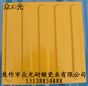 盲道砖是以石英、长石、粘土为主要原料,经高温氧化分解制成的耐腐蚀材料,产品背部加燕尾槽,施工时便于与耐酸泥牢固粘接,不易脱落。即可保证工程质量,又能延长工程使用寿命。