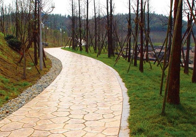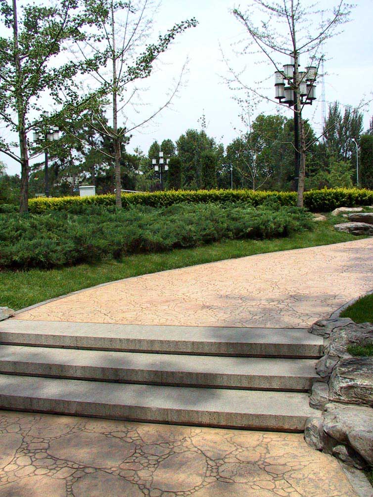 混凝土压花地面铺装:彩色压花艺术地坪(又称压花地坪、印花地坪、印模地坪、压模地坪、仿真地坪、彩色混凝土、幻彩地坪、彩色地面等,主要成分由强化料、脱模料、罩光剂三部分组成)广泛适用于室内外,室外主要用于公园、人行道、高档小区、步行街、停车场、文化广场、游乐场、度假村等。