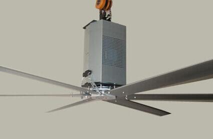 【工作原理】工业大吊扇可推射大量气流到地面,在地面形成一定高度的气流层水平运动,从而促成了整体空气循环;这样的好处在于全方位的地面覆盖和空气的立体循环。