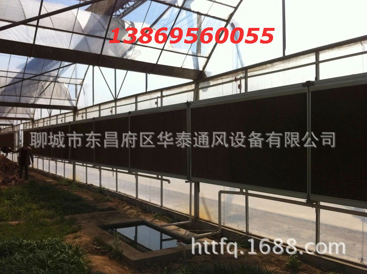 湿帘是安装在窗户的另一侧,空气穿过湿帘蒸发,再由风扇吹向各各角落,致使室内温度迅速下降起来. 温室结构与湿帘必须完善配合才能发挥湿帘最大的功率