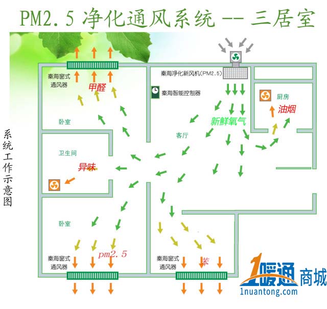 3.换气功能强,长时间送风,新风系统能有效将各个房间内的异味、有害气体、污染物和湿气等排到室外,并通过安装在窗框上或墙上的进风口将新鲜空气引入室内,完成空气置换。