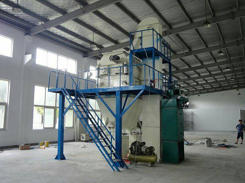 3、配料装置: 由料斗计量秤、供料蛟龙、排料装置、控制系统等组成。它可根据配方将不同原料自动计量,减少劳动力强度和环境污染,保证干粉砂浆产品质量。