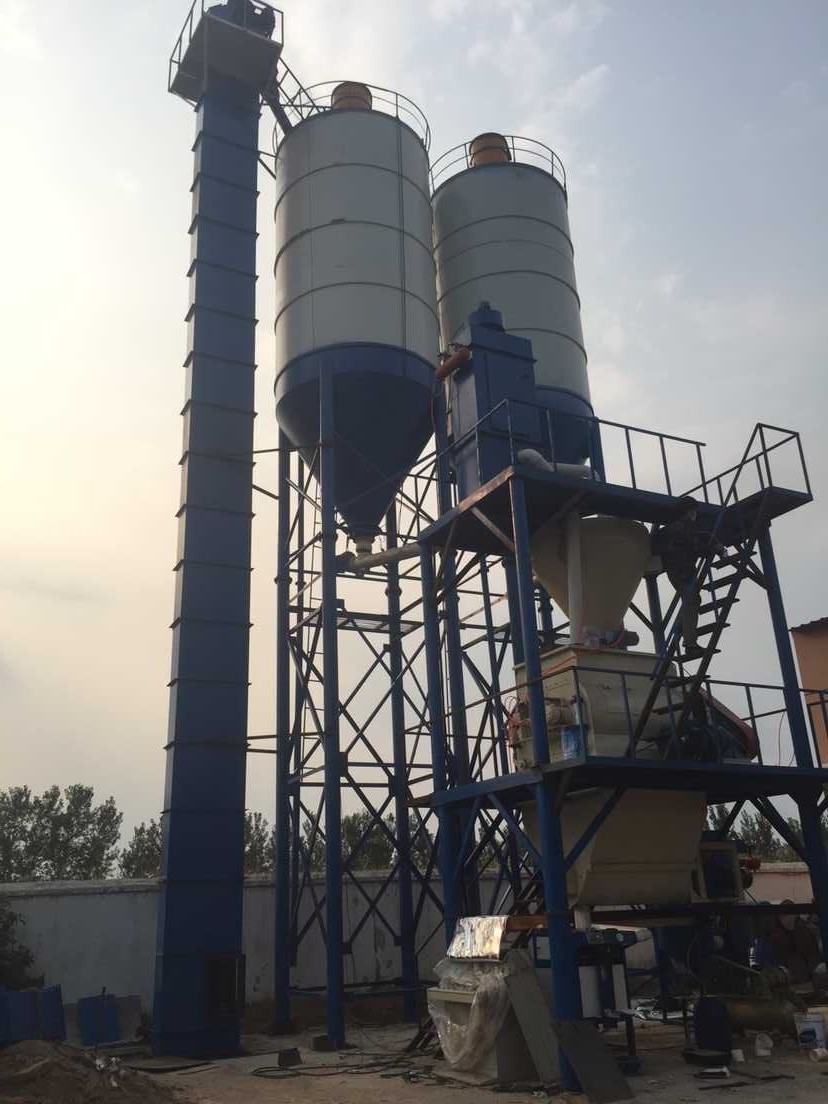 1、原料罐: 干粉砂浆成套设备中用于储存水泥、粉煤灰等,采用泵车气动送料,无需设置提升装置。仓顶设有除尘器,可有效保护工作环境。锥体部位气动破拱装置,可有效防止水泥、粉煤灰结拱,保证计量螺旋配料顺畅。