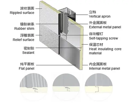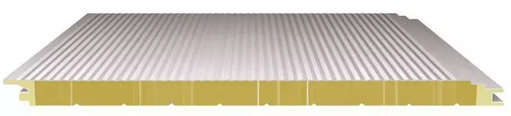 上压型钢板、优质岩棉材料、下压型钢板、两侧为聚氨酯。