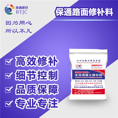 黑龙江保通高科建材科技有限公司,是专业的"道路材料与养护方案集成商",专注于高科技筑路新材料和道路养护新材料的研发、推广、服务工作。公司生产的水泥路面修补料专门针对水泥混凝土路面的麻面、空鼓、起皮、起砂、脱壳、裂缝、露筋、掉皮、露石子等病害进行及时修补,直接涂抹在病害部位即可,有超强的抗压和粘接强度,可实现超薄修补,在高速和高压的行车状态下不会出现破碎和脱落现象;凡是水泥混凝土表面病害均适用于本材料。