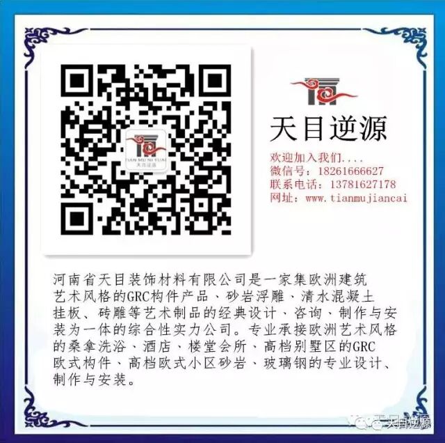 天目公司是一家集欧洲建筑艺术风格的GRC构件产品﹑砂岩雕塑﹑玻璃钢雕塑等艺术制品的经典设计﹑咨询﹑制作与安装为一体的综合性实力公司。天目公司拥有一批资深的艺术雕塑师和技术精湛的模具制作师﹑设计师。专业承接欧洲艺术风格的桑拿洗浴﹑酒店﹑楼堂会所﹑高档别墅区的GRC欧式构件﹑砂岩﹑玻璃钢的专业设计、制作与安装。