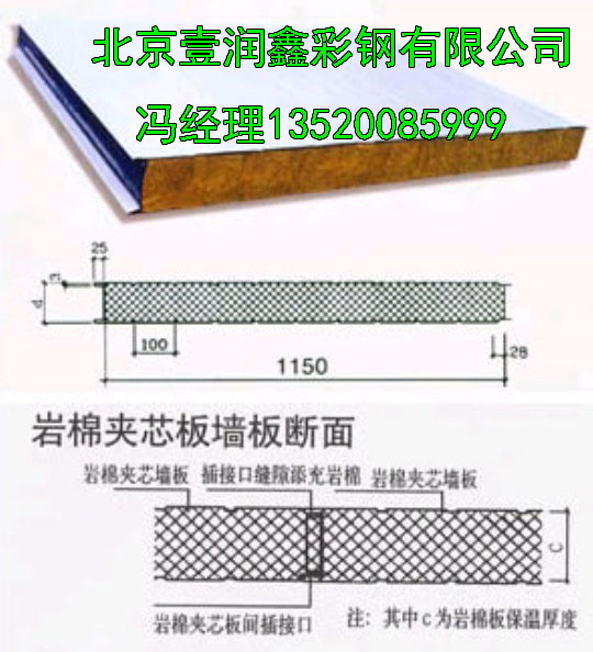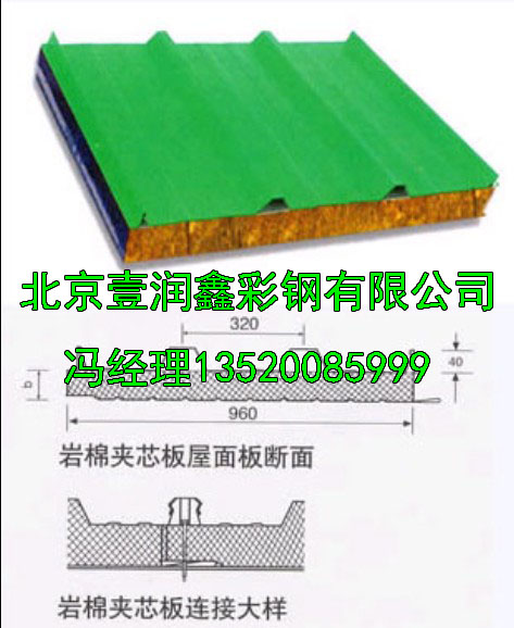 壹润鑫生产加工产品包括岩棉夹芯板,聚苯夹心板,岩棉复合板,新型岩棉复合板,岩棉复合板,品种齐全,欢迎新老客户咨询采购岩棉复合板,岩棉彩钢夹芯板 产品特点:彩钢岩棉复合板产品为A级防火板材 1.防火性能好:岩棉物为内芯层或玻璃纤维,可是任意防火等级要求; 2.彩钢岩棉复合板隔热保温:导热系数λ≤岩棉0.044w/m.k 导热系数λ≤玻璃棉0.031/m.k; 3.彩钢岩棉复合板色泽鲜艳:不需要表面装饰,彩钢板防腐层保持期为10 15年,彩色镀铝锌板防腐层保持为30 45年; 4.彩钢岩棉复合板抗弯抗压,承载力高:即可作护围结构,又可作承重结构,一般房屋不用梁柱; 5.彩钢岩棉复合板安装灵活:夹芯板的宽度为950型 1150型,表面层可压筋和不压筋,长度可按用户要求长度定尺寸生产,施工周期短,综合造价低; 6.彩钢岩棉复合板适用范围:产品外形美观、色泽艳丽,承重、保温、防火、防水性能强,欢迎广大客户来电洽谈!