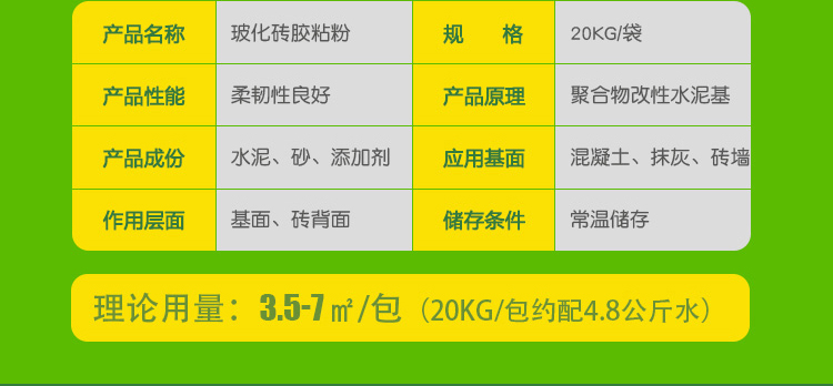 派力戈玻化砖胶粘粉是特别为玻化砖在室内外墙面的粘贴而设计,该产品具有粘结强度高,适用范围广,耐候性好的优点,并且无毒环保。