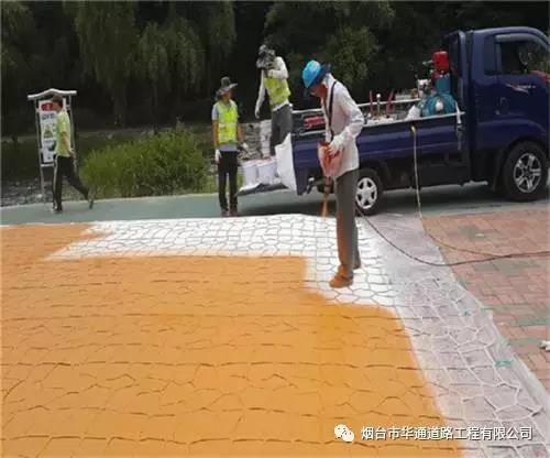 彩色路面专用喷涂剂是烟台华通公司自主研发的彩色路面改色剂,可以对水泥、沥青混凝土道路及各种人行道板等路面进行任何颜色的改色美化。相比彩色防滑铺装,施工工艺简单,成本低,封层颜色更加鲜艳、靓丽、持久,与原面层的粘附性更好,强度、耐候性、耐磨性更佳。采用常规的喷涂工艺,直接喷涂在稳定的沥青路面、水泥混凝土及人行道板等面层表面,并可根据景观设计或交通的特殊要求设计各种亮丽色彩。