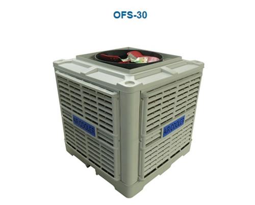 工作原理是:通过风机抽风,机内产生负压,空气穿过湿帘,同时水泵把水输送到湿帘上的布水管,水均匀地湿润整个湿帘的接触面,而且湿帘的特殊角度使水流向空气进风的一侧,吸收空气中大量的热量,使通过湿帘的空气降温,同时得到过滤使送出的风变得凉爽、湿润且清新。而未蒸发的水落回底盘,形成水路循环。底盘上设有水位感应器,当水位降落到设定水位时,自动打开进水阀补充水源,当水位达到预定高度,将自动关闭进水阀。