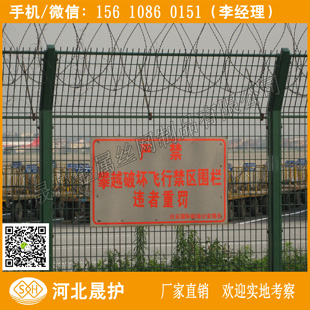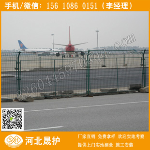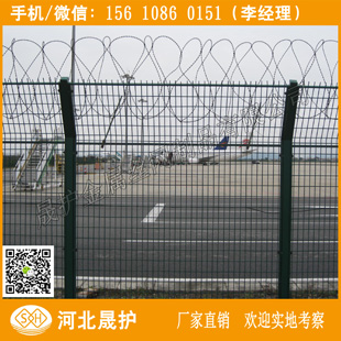 机场护栏网厂家可直接生产机场外围护栏网,还叫做机场围栏网、机场防护网、飞机场隔离栅、Y型柱护栏网等,是一种高防御、高稳固性产品,由低碳冷拔钢丝焊接成的钢丝网片、钢管固定立柱、刺铁丝(刺绳)或者刀片刺绳(可不选),相结合而成的一种防护网产品,适用于机场防护、高速公路护栏网、铁路护栏网、市政园林护栏网、军事基地、个人防护等需要高防护的地方。
