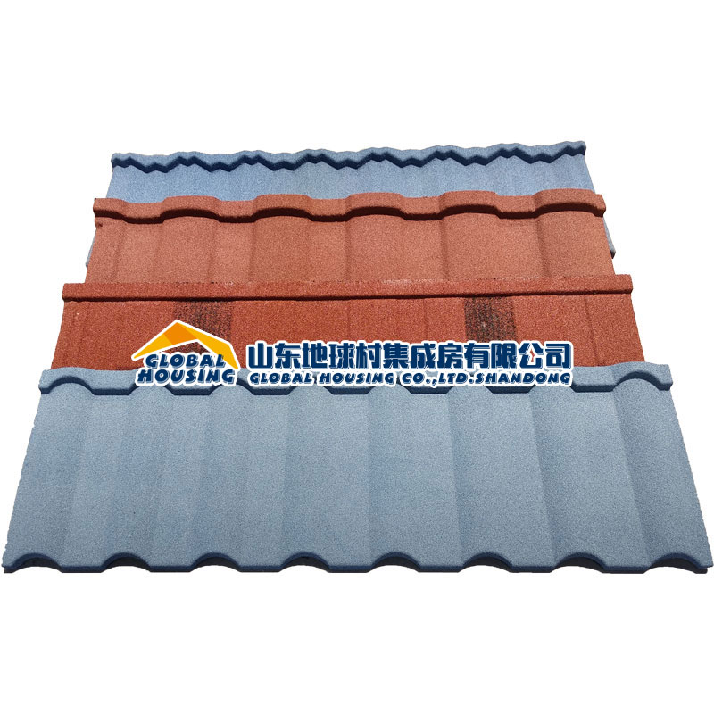 综上所述现在有一种新型屋面瓦-----彩石金属瓦就特别适合这些要求,彩石金属瓦受到如此的欢迎,主要是因为这种瓦是以防腐性能优异的镀铝锌钢板为基板,以耐候性较强的水性丙烯酸树脂为黏合剂,以彩色沙砾为面层,经特殊工艺加工制成的新型屋面材料。具有了较强的耐水、耐热、耐冻、耐光、耐腐、耐老化等性能和较长的使用寿命,是绿色环保新型建材产品。