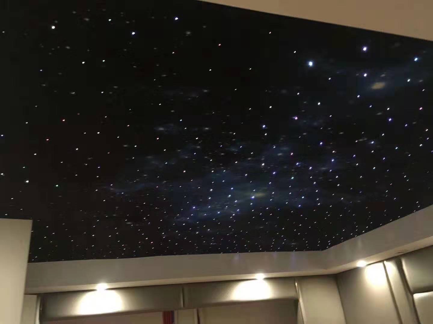 目前星空顶普遍采用的材料是光纤灯,设计师巧妙的将星空顶光纤灯应用到私人影院、影音室、视听室装修设计里面。