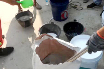 在气温较低时为了保证混合物的流淌性,可以适当减少C(填料)的用量(可减少1/2料)。