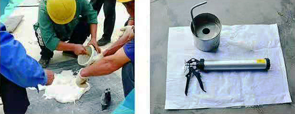 ⑵ 改性聚硫嵌缝密封胶的材料配置:打开A组份包装桶盖。将B组份加入A组份包装桶内,用低速电锤搅拌工具自上而下搅拌三分钟,至胶料颜色均匀一致,即完成配制和混胶工艺。