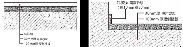 GS-1减振隔声砂浆施工方便,直接加水搅拌即可。于结构楼板上直接抹减振隔声砂浆不少于30mm厚。避免了复杂的节点处理,减少了交叉作业,与传统的“浮筑楼板”相比,节约了房屋内的净空高度。不易形成声桥,不空鼓、不开裂,性价比高,综合成本低,减振隔声性能优异。