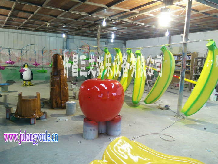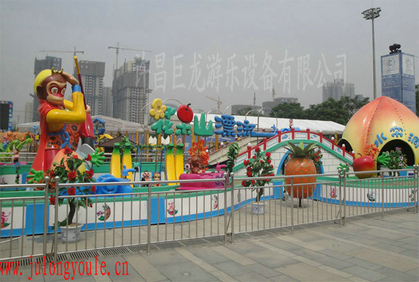 果果山漂流的设计基础是《西游记》中的神话形象“齐天大圣孙悟空”及“花果山水帘洞”,孙悟空高达4.28m,而水帘洞高度可达10米高,设备内部建筑在充分保留了神话人物原型的同时融入了大量现代的元素风格,可谓是融贯今古。而建筑的造型则选用了巨型苹果、巨型香蕉、巨型蜜桃的外在形象,色彩丰富诱人,色泽明丽清新。所有的“建筑”都带有红外线感应,游客可以在漂流的同时按电钮玩游戏,只要打中目标的靶心,就会出现相关的场景。比如打中孙悟空,猴哥就会吐云吐雾、大闹天宫;打中假山,假山会喷水;打中巨型香蕉下的猪八戒会上下跳动。该设备充满了神话色彩,寓教于乐,益智童趣,是一款不可多得的趣味性极高的游乐设备,一进入市场就得到了众多游客的青睐!短短几年间已经安装遍布全国各地,花果山漂流实现了可以根绝客户场地进行设计,这样可以为那些场地小但是想上花果山漂流而犯愁的客户进行选择。