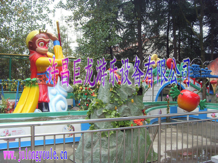 “果果山漂流”利用周边水系组成环形水上漂流,长达52米的曲型水道可供游客漂流,使游客畅享漂流的乐趣。花果山漂流的设计基础是《西游记》中的神话形象“齐天大圣孙悟空”及“花果山水帘洞”,孙悟空高达4.28m,而水帘洞高度可达10米高,设备内部建筑在充分保存了神话人物原型的同时融入了大量现代的元素风格,可谓是融贯今古。所有的“建筑”都带有红外线感应,游客可以在漂流的同时按电钮玩游戏,只要打中目标的靶心,就会出现相关的场景。比如打中孙悟空,猴哥就会吐云吐雾、大闹天宫;打中假山,假山会喷水;打中巨型香蕉下的猪八戒会上下跳动。该设备充满了神话色彩,寓教于乐,益智童趣,是一款不可多得的趣味性极高的游乐设备,一进入市场就得到了众多游客的青睐!