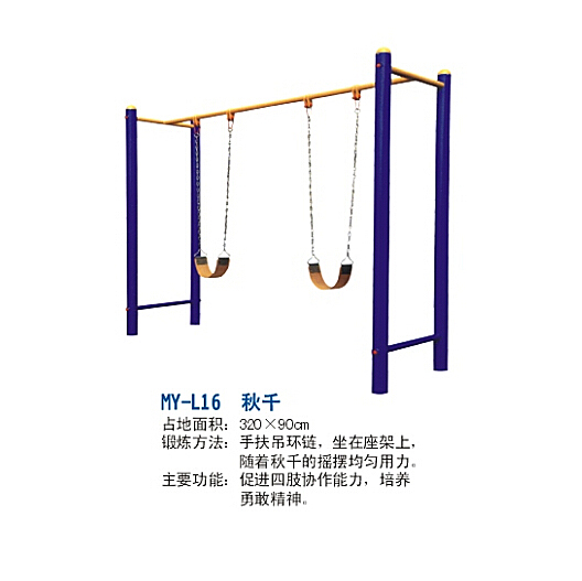 规格1200x704x1116mm,主柱管材114x3mm标准钢管,主横梁60x60x3mm标准方管,链条采用8mm无缝铁链,座垫采用橡胶帆布带,产品所有连接结构具有防盗防锈防松措施。表面处理工艺脱脂-酸洗-磷化-抛丸-静电喷涂。器材涂饰层室外耐候性粉末,安装方式直埋式。