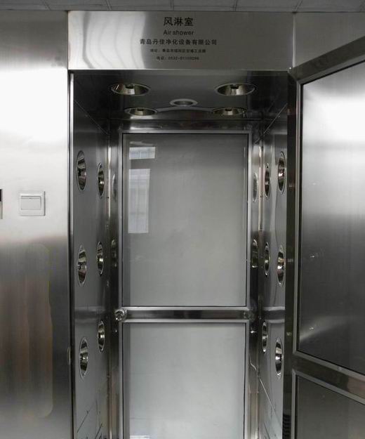 风淋室是人进入洁净室所必需的通道,它可以减少人进出洁净室所带来的污染问题。风淋室的两道门电子互锁,可以兼起气闸室的作用,防止未被净化的空气进入洁净室,本公司生产的高科技智能语音风淋室带有语音提示系统,人在吹淋时由自动语音系统提示让人有次序的完成整个吹淋除尘过程,人性化语音提示给人一种亲切感觉,并达到有效的净化效果,经高效过滤器过滤后的洁净气流由可旋转喷嘴从各个方向喷射至人身上,有效而迅速清除尘埃粒子,清除后的尘埃粒子再由初、高效过滤器过滤后重新循环到风淋区域内。