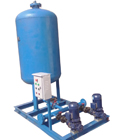 囊式定压罐是利用气体的可压缩性能设计的,它是在管网系统和管网补水泵之间增加了一台囊式定压罐,同时在管道上增加电接点压力表,电接点压力表将直接显示管网的系统压力,当系统压力低于设置最小压力时,电接点压力表将传输信号给管网补水泵,管网补水泵开始工作;当系统压力大于设置最高压力时,电接点压力表将传输信号给管网补水泵,管网补水泵停止工作。在管网补水泵停止工作后,系统压力靠囊式定压罐来补偿,当管网系统压力下降时,囊式定压罐内的气体要自然膨胀,罐体内的水在气体压力下自动补入系统;当囊式定压罐内的水减小到一定程度,靠管网补水泵来实现增压,罐内的气体再次被压缩。如此往复的工作,实现对管网系统的稳压。