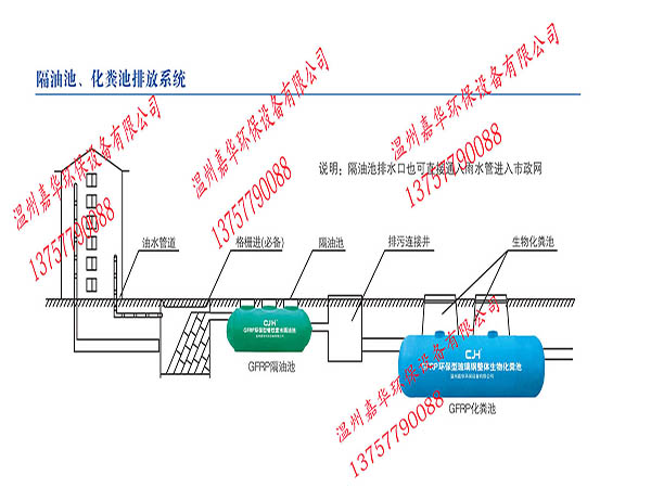 六、 当隔油池埋设在地下室,处于标高低于城市排水管网时,需别设污水积水池,使用污水潜水泵将废水排入管网。
