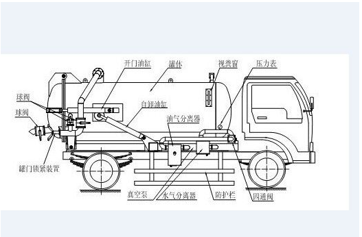 主要由福田原装底盘(全国联保),真空吸污泵、取力器、传动轴、水气分离器、油气分离器、多路换向阀、罐体、放污阀、视污窗、真空压力表、管网系统、液压系统、操作系统等组成。