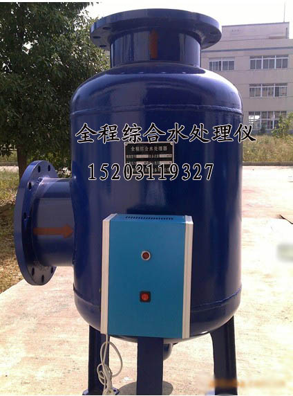 全程水处理器主要由优质碳钢筒体、特殊结构的不锈网、高频电磁场发生器、电晕场发生器及排污装置等组成。通过活性铁质滤膜,机械变经孔阻挡及电晕效应场三位一体的综合过滤体,吸咐、浓缩在实际运行工况下各种水系统形成的硬度物质及复合垢,降低其浓度,达到控制污垢及大部分硬度的目的。并通过换能器将特定频率能量转换给被处理的介质——水,形成电磁极化水,使其成垢离子间的排列顺序位置发生扭曲变形,当水温升高到一定程度时,处理的水需经过一段时间方能恢复到原来的状态。在此价段,成垢的机率很低,因而达到控制形成硬度垢的目的。同时器壁金属离子受到抑制,对无垢系统具有防腐蚀作用。此外,电磁极化水还可有效地杀灭水中的菌类,澡类等,有效地抑制水中微生物的繁殖。所以,全程综合水处理器在系统正常运行状态下,可以完成防结垢,防腐,杀藻,超净过滤,控制水质的综合功能。