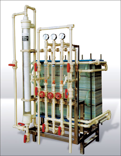 电渗析器是利用离子交换膜的选择透过性进行工作,电渗析器主要组成部分是离子交换膜。电渗析器中离子交换膜在直流电场作用下,对溶液中电解质的阴阳离子具有选择透过性。即阳离子可以透过阳膜,阴离子可以透过阴膜。由隔板和膜组成的隔室,其淡室中的阴离子向阳极方向迁移通过阳膜而被浓室中的阴膜阻留在浓室中;阳离子则向阴极方向迁移通过阳膜而被浓室中的阴膜阻留在浓室中,由此淡室中的溶液可以淡化,浓室中的溶液则增加浓度,从而达到淡化、提纯、浓缩或精制的目的。