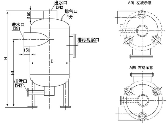 1、旋流除砂器应安装在供水管网的主管道上并固定在基座上,进水和出水管之间需加旁通。