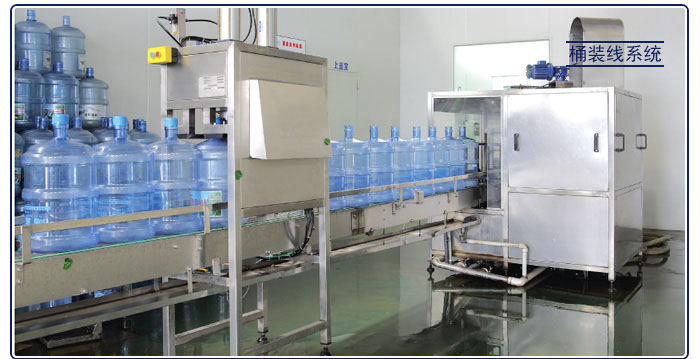 桶装饮用水生产线专供灌装3加仑或5加仑的各种圆形、方形桶桶装线。按产量不同分多种型号,由洗桶、灌装、封口三部分组成,洗桶部分采用洗涤喷射、消毒喷射、纯水冲洗等多道工序,消毒液可循环使用。灌装时间可微调,消毒、灌装、压盖、输出等过程均自动控制,是集机、电、气于一体的先进灌装设备。