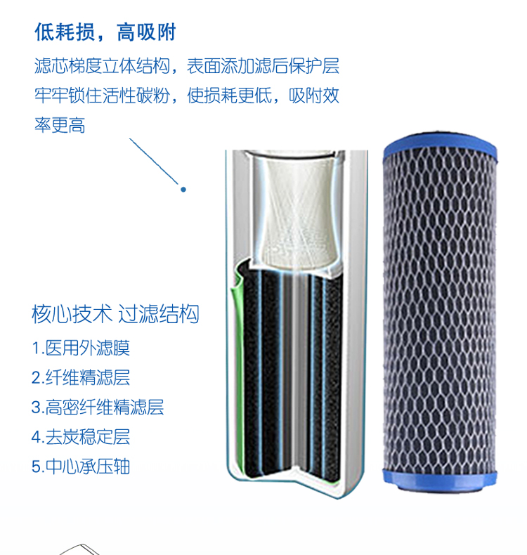2. 升级立体过滤结构,增加银离子作为材质,长效去除部分有害化学物质,致病微生物等,包括大肠杆菌在内的细菌和孢囊菌。
