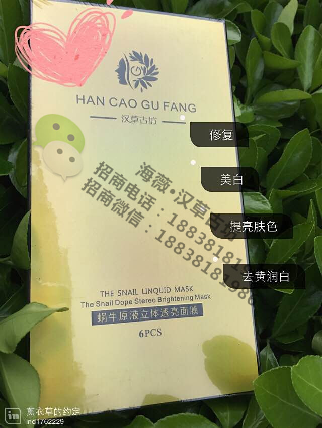 汉草古坊汉草古坊分四种汉草古坊的功用、1.雪莲花保湿:通过高科技手段,经历多到繁琐工序,从珍贵稀有百草之王雪莲花中,萃取出可延缓肌肤衰老的成分。这些成分具有强效的活血通络,防止肌肤衰老功效,质地清爽不油腻,吸收迅速,另因缺水而干燥;紧绷敏感的肌肤恢复光滑,柔软,健康有弹性,使肌肤感觉滋润、舒适、不紧绷。2、藏红花修复冰膜:比还要贵的补水成分,无毒无污染,消除自由基抑制黑色素形成,分解沉淀黑色素,美白、延缓衰老,去除皱纹,提高皮肤弹性,保护肌肤年轻。3、光甘草3D御白:是最具有美白功效的一种成分,被誉为“美白”是目前公认的疗效最好,有效仰止抑制黑色素生成,同时还具有防止皮肤粗糙和抗炎,抗菌的功效。4 、七白汉方净白:经历多种繁琐工序,从七白系列本草中萃取出的本草弹力水营养活性因子,汗草亮白活性因子与皮肤接触的瞬间,渗入肌肤深层,作用于皮肤变黑过程的每一步,从而获得完善的润白,亮白净白三重功效,立体解决色斑问题,缔造净白无瑕的肌肤。号:18838181986或QQ1203716677
