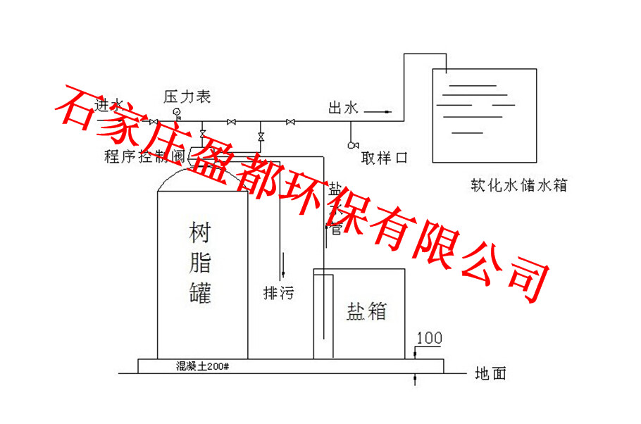 1、运行原水在一定的压力,流量下,流经装有离子交换树脂的容器(软化器)。树脂中所含的可交换离子Na ,与水中的阳离子,进行离子交换,使容器出水的钙 ,镁含量达到我们的要求。