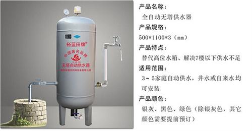 无塔供水器工作进程:无塔供水器(压力罐)内有均匀常压空气,装置压力开关、压力表及管网后成为密封容器。水泵发动,罐内水位上升,罐内空气被紧缩,发生气压。气压到达设定压力,无塔供水设备水泵停止作业。因气压效果,罐内水可高速流出。罐内水位下降后,气压下降,到达设定压力,水泵又主动发动,循环往复,主动循环,给水设备其实质就是一套小型家用自来水体系;